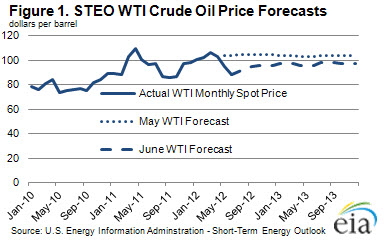 Yesterday, the U.S. Energy Information Administration (EIA) issued its June Short-Term Energy Outlook (STEO) , which included significant downward revisions to the crude oil and petroleum product price forecasts for the second half of 2012 (Figure 1). The changes come after a combination of concerns regarding economic growth and moderating supply-demand balance expectations contributed to a steep drop in global crude oil prices in May. As a result, EIA is now forecasting West Texas Intermediate (WTI) crude oil spot prices to average about $95 per barrel for the rest of 2012. Similarly, the average crude oil refiner acquisition cost (RAC) is now expected to be about $11 per barrel lower in the second half of 2012 compared with the May STEO. The lower forecast for crude oil prices has translated into a lower forecast for product prices. Regular gasoline is now expected to average $3.51 per gallon nationally in the third quarter, down from the $3.76 per gallon forecast in May.