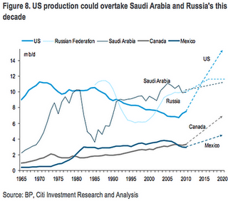 Gasoline prices remain high, and Reuters recently noted that there are enough countries with civil unrest, technical problems and bad weather that there are around a million barrels a day of possible supply that are not getting to the market. . Yet with Saudi Arabia continuing to reassure that it is willing to pump more oil, if needed, there appears to be, superficially, little cause for supply concerns this year. By the same token, in the longer term, concerns over supply also seem to be increasingly discounted. For example Citigroup has just released a new report on Energy 2020:North America as the new Middle East. The report suggests that there is really no concern with future supplies of oil and gas, perhaps most clearly shown with this plot: