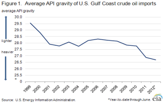 Increased production of U.S. domestic crude oil, particularly light sweet crude from tight oil formations in Texas and North Dakota, has been replacing imports of foreign light crude oil processed by U.S. Gulf Coast refineries. With Gulf Coast imports of heavier crude oil remaining steady, this shift in light crude supply from imports to domestic production has changed the average quality of crude oil imported into the U.S. Gulf Coast (PADD 3).