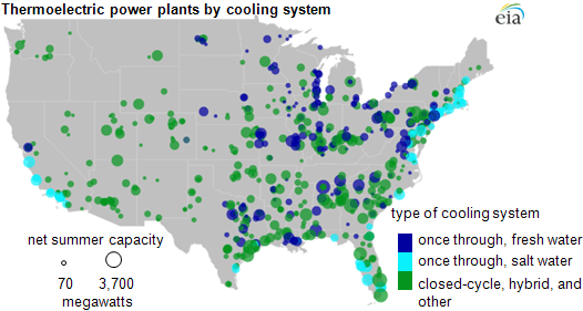 The map above shows the relative size of electric power plants, expressed in megawatts, for the subset of power plants that reported operating cooling systems, by type, that withdrew water for cooling during 2011 (the latest full summer season of data available).
