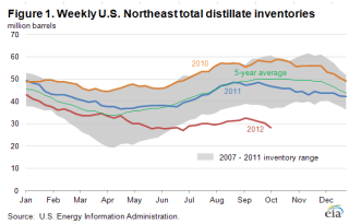 In petroleum markets, October is typically the time when attention shifts from transportation fuels to heating fuels. Strong global distillate demand and refinery outages have supported prompt distillate prices relative to those in the future. In its October 2012 Short-Term Energy and Winter Fuels Outlook the U.S. Energy Information Administration (EIA) is projecting that retail heating oil prices will average $3.80 per gallon this winter (October-March), which would be $0.07 per gallon above last winter’s average of $3.73 per gallon, and the highest on record. Historically, heading into winter, heating oil prices for future delivery are higher than those for current delivery, encouraging inventory builds. However, this year, prices for future delivery are below current prices, so there is little if any incentive to buy product now and store it for sale later in the winter.