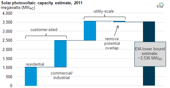 EIA is improving its data collection to address this issue. Meanwhile, EIA presents this lower bound based on existing electric power industry survey data: at the end of 2011, EIA data show U.S. solar PV capacity was at least 3,536 megawatts (MWAC). The chart above summarizes the calculation (also, see below).