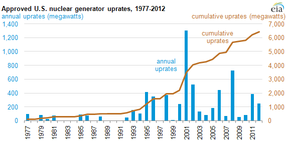 Currently (as of July 2012), there are 104 commercial nuclear reactors in the United States. In 2011, these plants provided 786 billion kilowatthours of electricity, or nearly one-fifth of total generation. The electrical output of the nuclear power plant fleet can be increased either by constructing new plants or by ‘uprating’ operating plants. Uprating generally involves physically modifying the plant to increase its generating capacity. Since 1977, more than 6,500 megawatts-electric (MWe) of nuclear uprates have been approved, and most of these have already been implemented. Through July 10, 2012, these cumulative uprates are roughly the equivalent of constructing six new nuclear power plants.