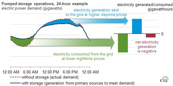 Pumped hydro storage operates by using electrically powered turbines to force water uphill at night to fill a reservoir. During times of the day when electricity demand is high, the water is released to flow downhill through turbines to generate electricity. Although more electricity is used to force the water uphill at night than is produced when it flows downhill during the day, shifting the availability of power from overnight generation to serve daytime load adds significant value.