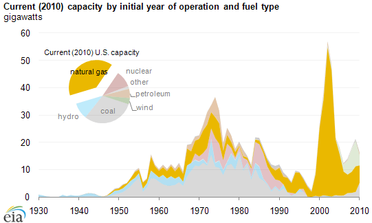 The June 16 edition of Today in Energy examined the wide age range of all electric power generators for all fuels; today’s article looks specifically at natural gas-fired generators. At the end of 2010, natural gas-fired generators constituted 39% of the Nation’s total electric generation capacity of 1,042 gigawatts (GW). Nearly 237 GW of natural gas-fired generation capacity was added between 2000 and 2010, representing 81% of total generation capacity additions over that period.