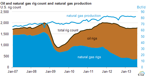 The number of wells drilled nationwide that have produced both oil and natural gas increased from 37% in 2007 to 56% in 2012 (see chart below). This increase helps explain why natural gas production can rise (as it has) even as the number of rigs characterized as drilling for natural gas has fallen.