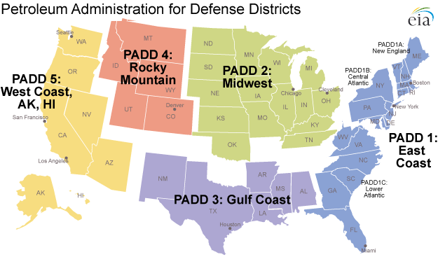 The Petroleum Administration for Defense Districts (PADDs) are geographic aggregations of the 50 States and the District of Columbia into five districts: PADD 1 is the East Coast, PADD 2 the Midwest, PADD 3 the Gulf Coast, PADD 4 the Rocky Mountain Region, and PADD 5 the West Coast. Due to its large population, PADD 1 is further divided into sub-PADDs, with PADD 1A as New England, PADD 1B the Central Atlantic States, and PADD 1C comprising the Lower Atlantic States. There are two additional PADDs (PADDs VI and VII) that encompass U.S. Territories (these are not pictured on the map). The PADDs help users of EIA\’s petroleum data assess regional petroleum product supplies.