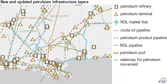EIA\’s State Energy Profiles and Energy Disruption pages have always included map layers for petroleum refineries, petroleum-fired power plants, and government stockpiles of crude oil (the Strategic Petroleum Reserve) and heating oil (the Northeast Home Heating Oil Reserve). EIA has now expanded these layers to include new asset families such as crude oil and petroleum product pipelines, as wells as petroleum terminals, petroleum ports, waterways for petroleum movements, natural gas liquids (NGL) pipelines, and NGL market hubs. The new layers also provide updated information on crude oil refineries and petroleum power plants: