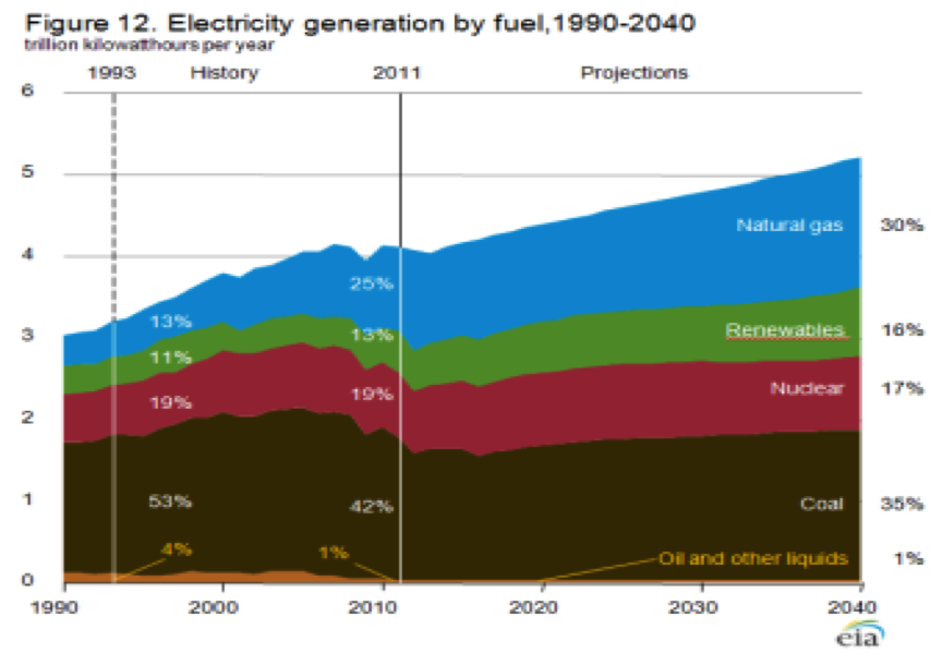 The EIA’s Annual Energy Outlook for 2013 projects a continuation of the rebalancing occurring in electricity generation in the USA (See figure 1), with gas rising to 30% of the US electricity mix by 2040. This switching of capacity from coal and nuclear power generation to gas generation is occurring already. For example, 2013 production estimates for electricity from natural gas are 10% higher than they were in previous estimates, with the difference driven by lower gas prices. Entergy has announced the retirement of their Vermont Yankee nuclear plant will occur in 2014, and falling wholesale electricity prices, caused by the natural gas boom, were blamed. Agitators for the Yankee plant’s shutdown noted; “natural gas is putting coal and nuclear out of business”.