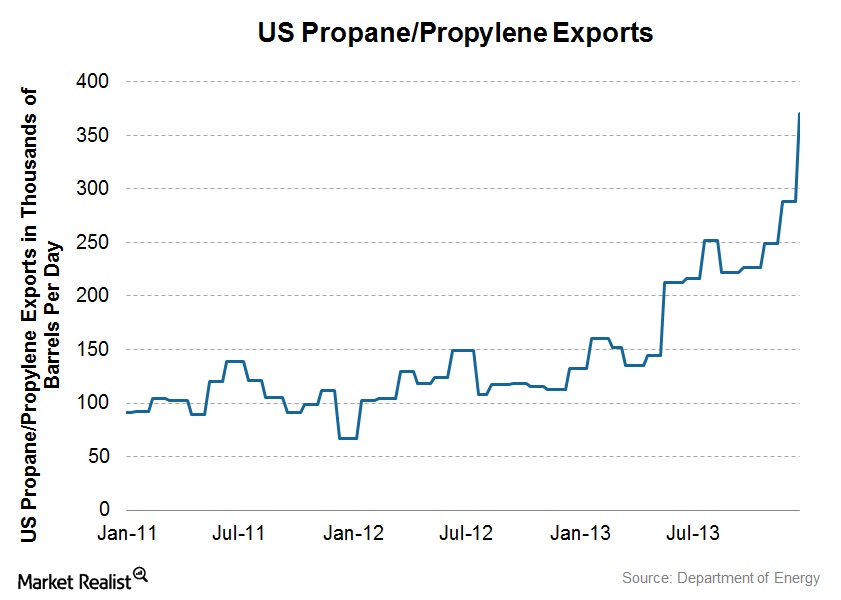 Propane exports have increased throughout 2013. First quarter propane exports averaged ~150 thousand barrels per day, second quarter propane exports averaged ~180 thousand barrels per day, third quarter propane exports averaged ~230 barrels per day, and fourth quarter propane exports to date have averaged ~270 thousand barrels per day. Most recently, the U.S. Department of Energy reported that as of December 20, propane exports were at 370 thousand barrels per day.