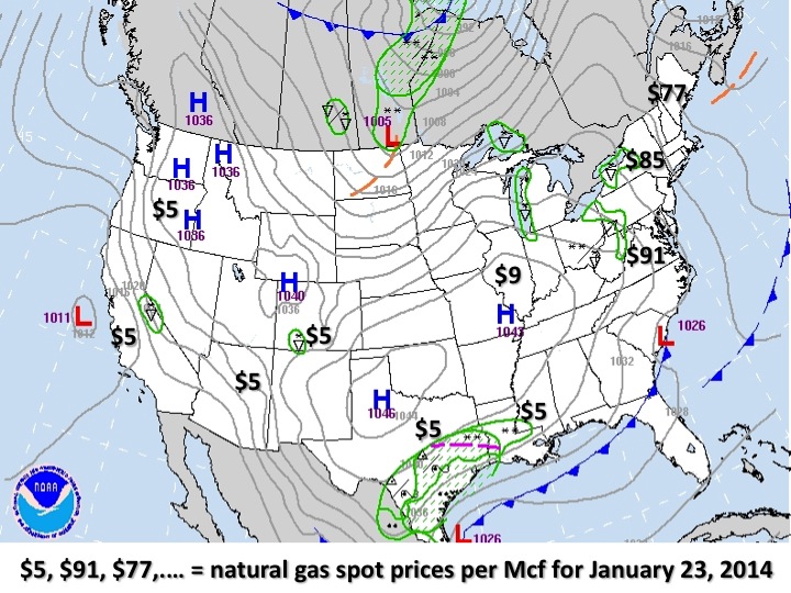 The cold affected electricity generation systems, particularly natural gas, in the Mid-Atlantic and the Northeast such that supply weakened and prices skyrocketed. In New England, natural gas faltered so much that regional grid administrator ISO-New England had to bring up dirtier coal and oil plants to try to make up the difference (Hartford Business). Just prior to the cold snap, ISO-New England had told the governors in the northeast that increased dependence of the region on natural gas has made the energy market in New England fragile (Seattle PI).