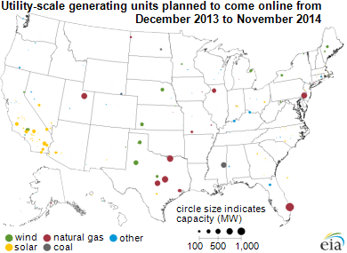 The state-level detail in the tables can be represented using maps like the one above. Maps make it easier to see, for example, the concentration of new solar generators in the Southwest, natural gas generators in Texas and along the Atlantic Coast, and wind generators in the Plains region that are expected to come online between December 2013 and November 2014.