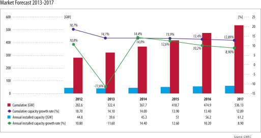 This look back, and look ahead, comes from the Global Wind Energy Council’s (GWEC) 2013 Market Statistics report. GWEC’s assessment found 12.5% cumulative global growth compared to 2012, resulting in “another difficult year for the industry.”