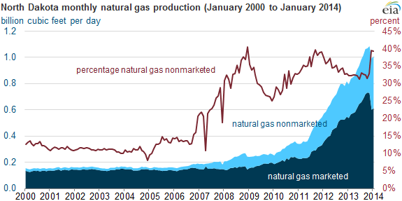 Natural gas production in North Dakota’s portion of the Bakken Shale formation has grown significantly, alongside the rapid rise in oil production in the state. Natural gas production has outpaced additions to the state’s gas pipeline capacity and processing facilities. As a result, the amount of nonmarketed natural gas output continued to grow in North Dakota through the end of 2013, rising to an average of 0.31 billion cubic feet per day (Bcf/d), almost double the 0.16 Bcf/d levels in 2011, according to the North Dakota Department of Mineral Resources. The temporary closure of a processing plant at the end of the year led to an increase in both the volume and the percentage of nonmarketed natural gas that continued into 2014. Most nonmarketed natural gas is flared into the atmosphere.