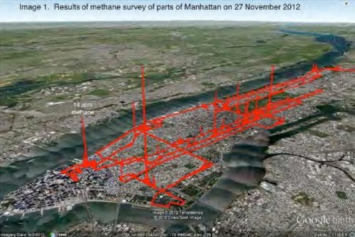 Currently the greenhouse gas equivalence of methane is widely accepted as at least 20 times the effect of carbon dioxide over a 100-year time frame. In other words, leakage of 1/20th, or 5%, of the methane moving through a natural gas production-transport-distribution system will effectively double the greenhouse gas impact of the use of that natural gas. That is, leakage of only 5% of natural gas from point of production to point of use would eliminate any greenhouse gas advantage of natural gas compared to other fossil fuels. More complex efforts by others have looked into the greenhouse gas emissions advantages of using natural gas instead of other fossil fuels. It appears that those more elaborate efforts are settling in at ≤3.2% gas loss to leakage as the maximum leakage rate at which use of natural gas retains an advantage. Hence, the loss of even a few percent of gas during production, transport, distribution and utilization is critically important to management and planning of present and future national and international energy supply and utilization systems. Therefore, it was concluded the extended GSI work effort should be focused on the need to assess total methane emissions. The available data was from Manhattan. Among the production, transport, local distribution and utilization systems, this work addressed the collective effect of only local gas distribution and utilization systems, along with any other methane sources that might be present in Manhattan.
