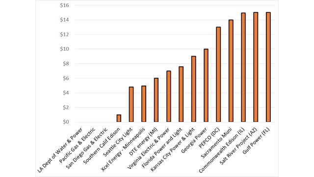 Interestingly, one of the three natural gas distribution companies in California has a fixed charge, but the other two don’t (SoCal Gas has a charge that is about $5/month. Feel free to chime in if you know how this difference came to be.) Most other electric utilities in the U.S. do charge some fixed monthly fee for being hooked up to the electric grid.