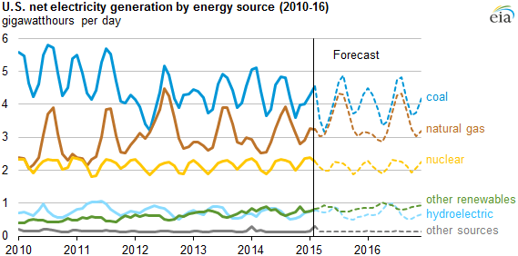 EIA’s most recent Short-Term Energy Outlook forecasts that the amount of electricity generation fueled by natural gas in April and May will total just 3.5% less than the projected amount of coal-fired generation. This convergence has occurred only once before, in April 2012, when natural gas fueled just 1.5% less generation than coal. Power generation from the two fuels is expected to rise at similar rates over the next couple months, and then diverge again later in the summer as demand rises and coal unit capacity utilization continues to rise.