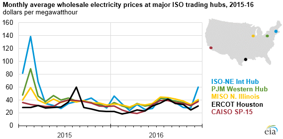 Average wholesale electricity prices at major trading hubs across the United States during the first quarter of 2016 were significantly lower than during the same period in 2015, ranging from 24% lower in California to 64% lower in New England. Monthly wholesale prices for the rest of 2016 were slightly below 2015 prices and generally averaged between $20 and $45 per megawatthour (MWh). The primary driver of the low wholesale electricity prices was the sustained low cost of natural gas, which is the fuel that often determines the marginal generation cost in most power markets. The low cost of natural gas also encouraged increased use of the fuel for U.S. power generation in 2016.