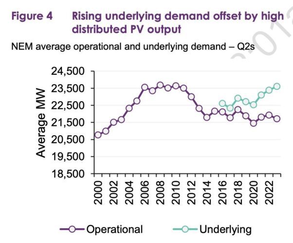 It meant that the average “operational” demand on Australia’s main grid – known as the National Electricity Market – fell to its lowest Q2 average since Tasmania joined the market in 2005, even though “underlying” demand jumping to its highest level since 2016 thanks to a cold snap in May.
