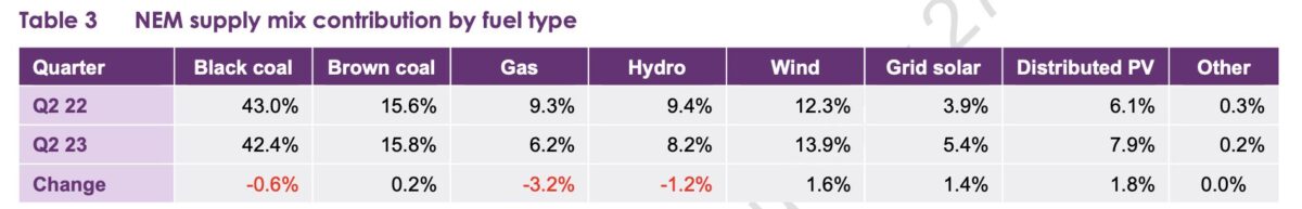 AEMO said generation of renewables rose – rooftop solar by 1.8%, wind (1.6%) and grid-scale solar (1.4%) compared to Q2 2022. But gas (-3.2%), hydro (-1.2%) and black coal (-0.6%) all decreased.