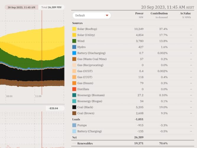 The new record for maximum instantaneous share of renewables on the NEM beats the record set only one day earlier, of 69.1% at midday on September 19, and notches up a major new milestone in Australia’s transition to a grid powered mostly by solar and wind.