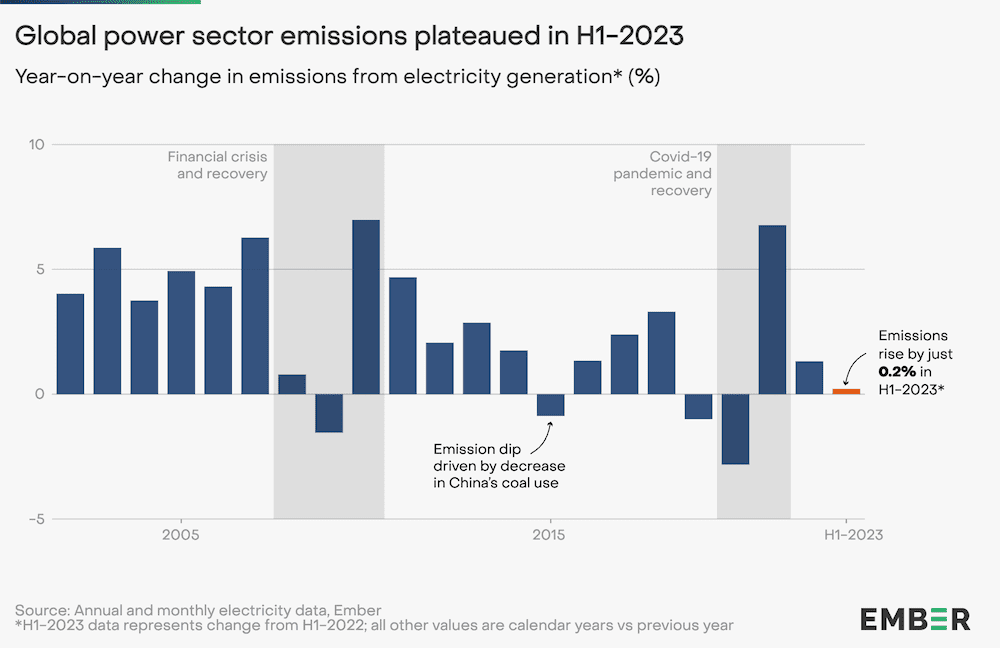 A new report by think tank Ember shows the global power sector saw emissions tick up by just 0.2 per cent in the first half of 2023, compared with the same period last year.