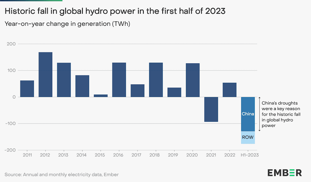 Although the world is seeing a rapid adoption of wind and solar, this was countered by falling hydro, as drought in China accounted for 75 per cent of a historic crash in global hydro generation of 177 TWh.