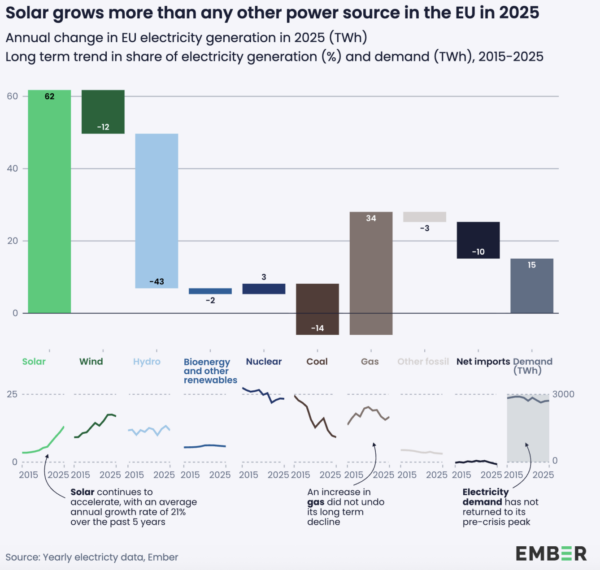 EU solar generation increased by over 20% for the fourth year running in 2025, with its share in the energy mix surpassing coal and hydro. For the first time in history, solar and wind generated more energy in the EU than fossil fuels.